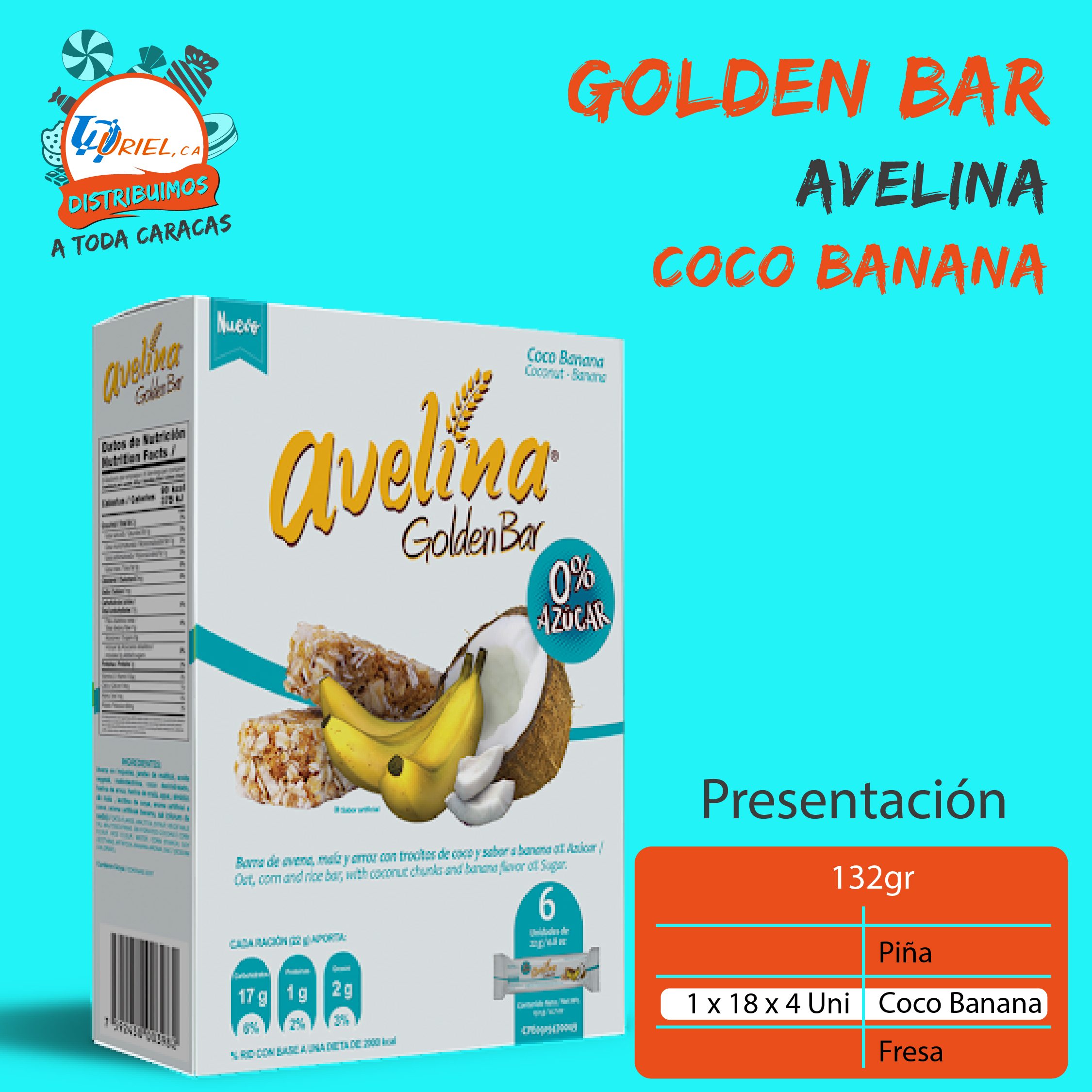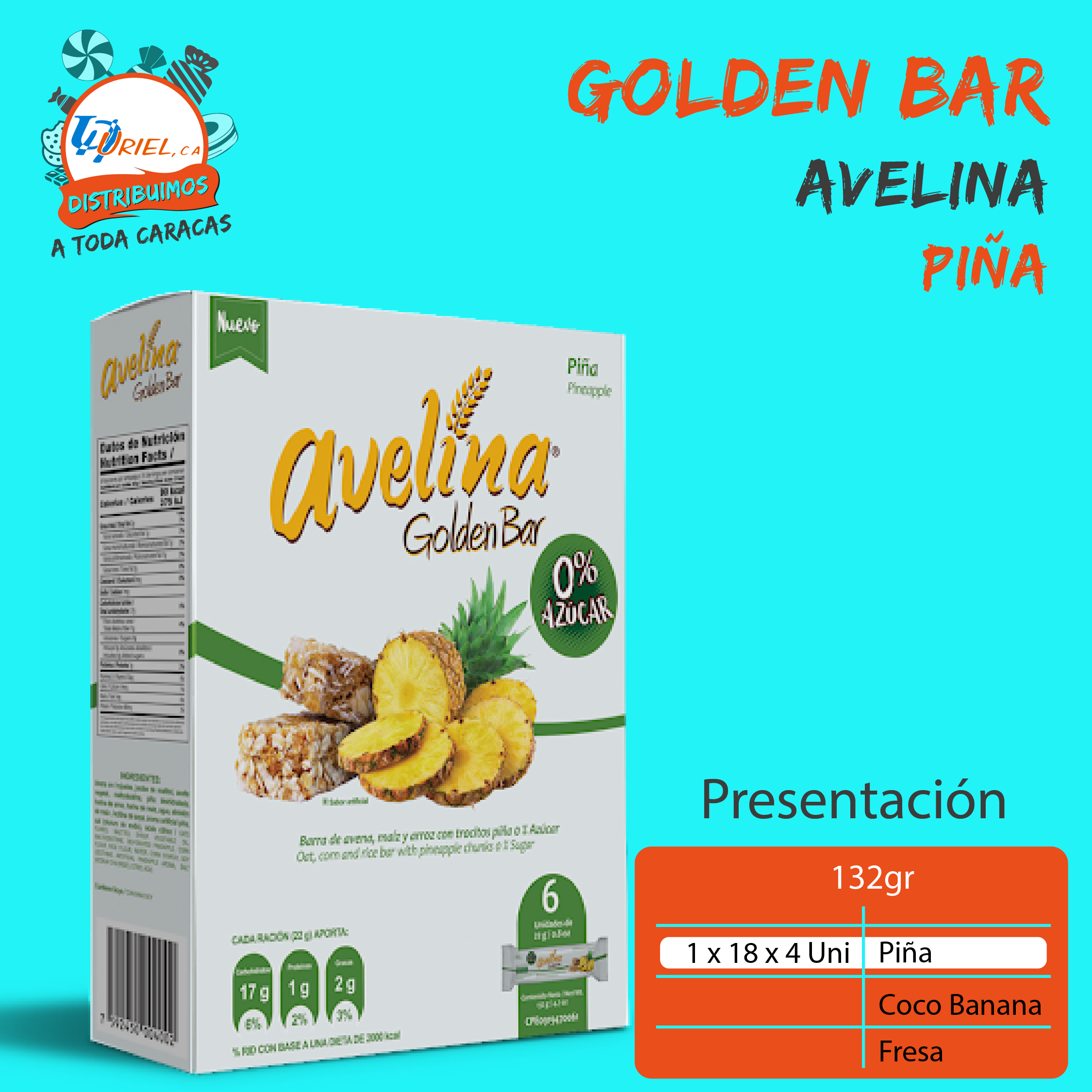 Avelina Golden Bar Sin azúcar son perfectas barras de cereal en caja de 132 gr en sabor a coco banana- piña y fresa.
