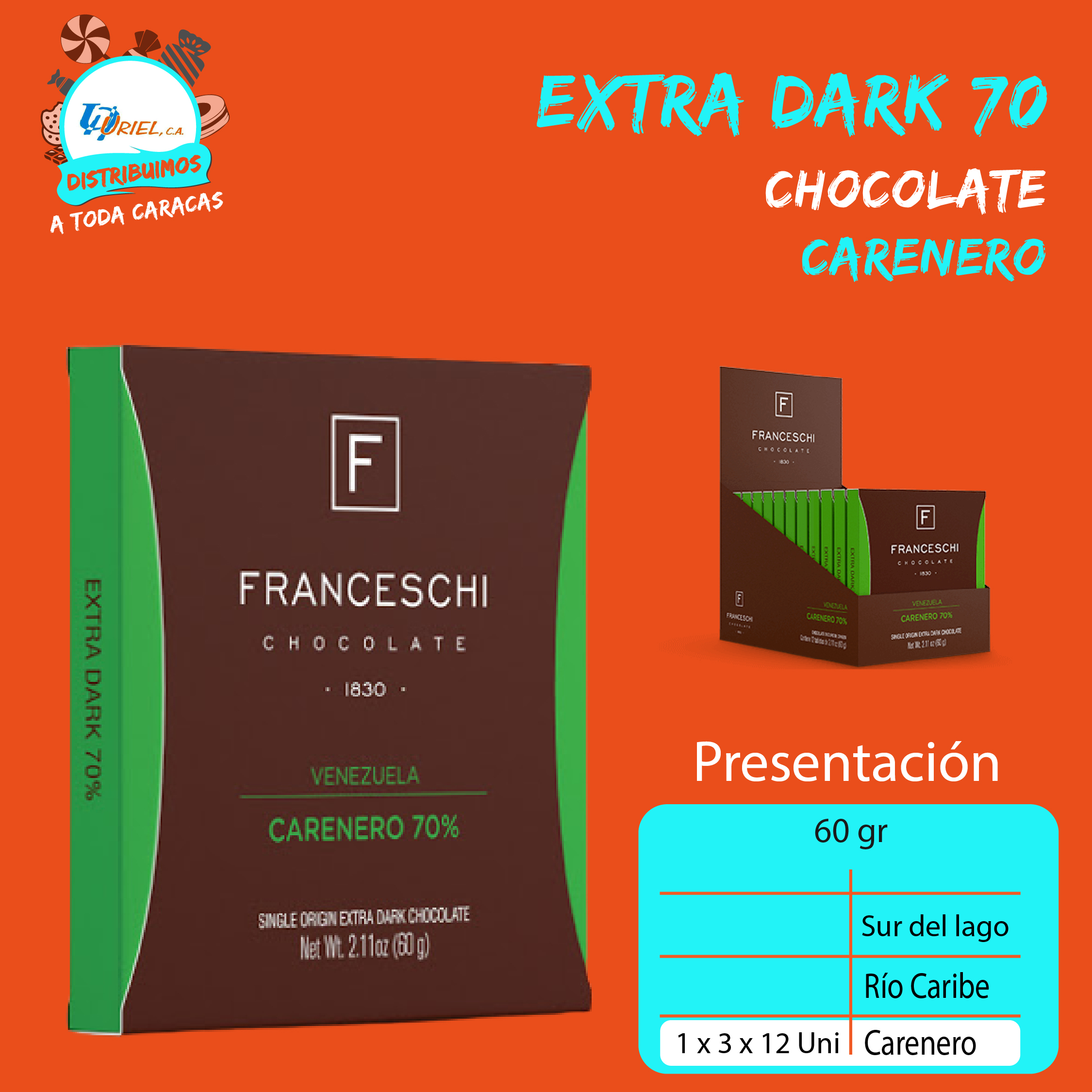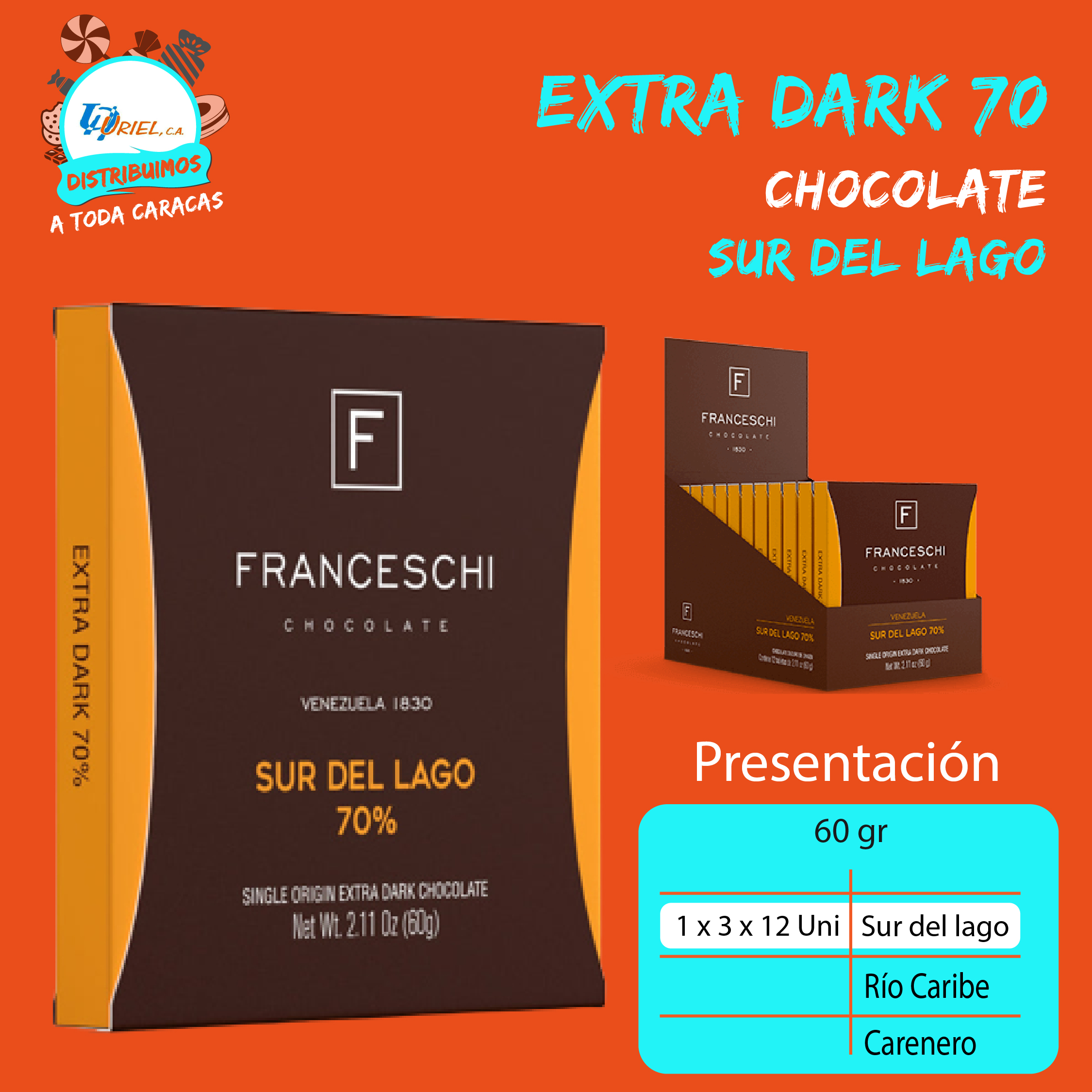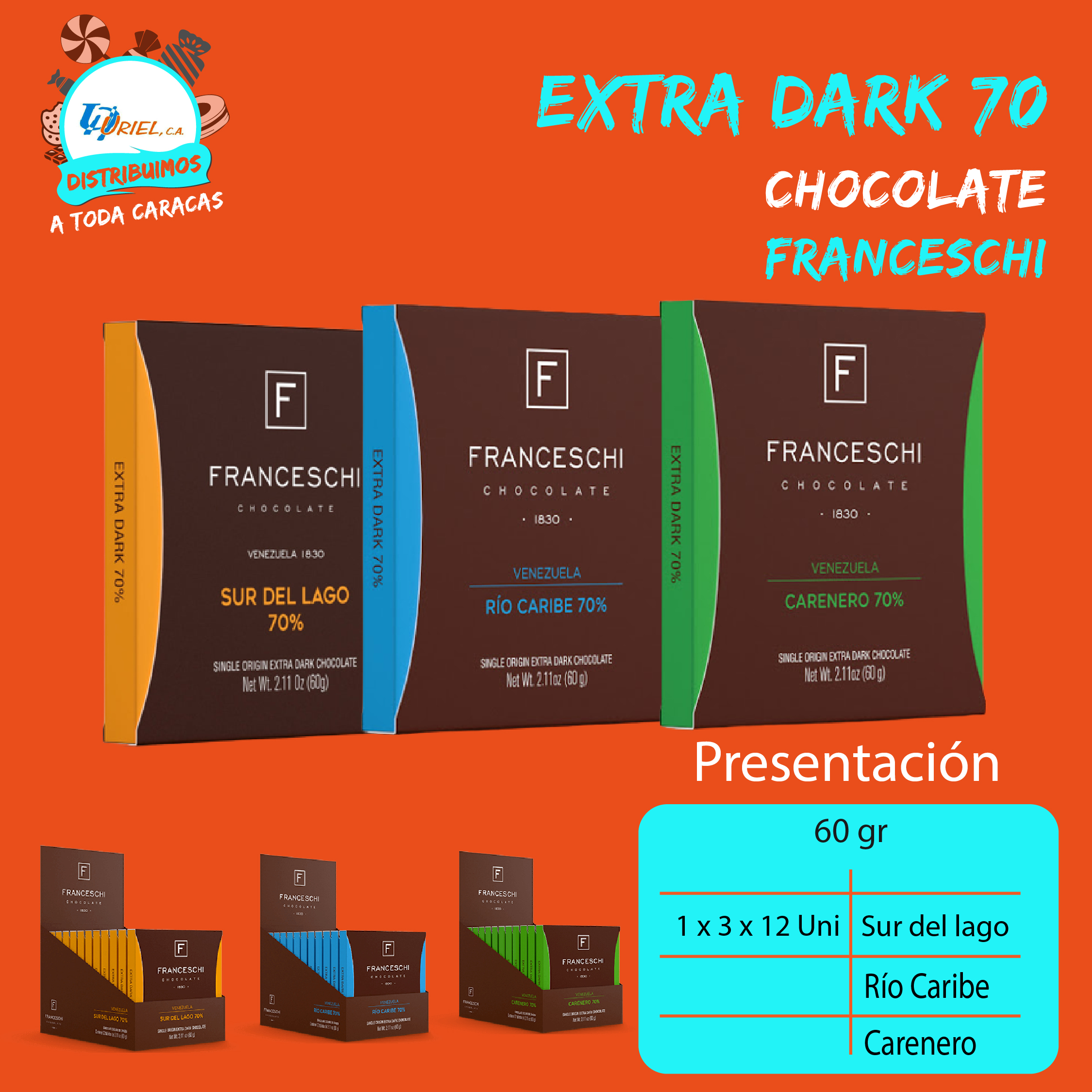 + ENVÍOChocolates Extra Oscuro de Franceschi en sus tres presentaciones: Sur del lago, Río Caribe y Carenero.