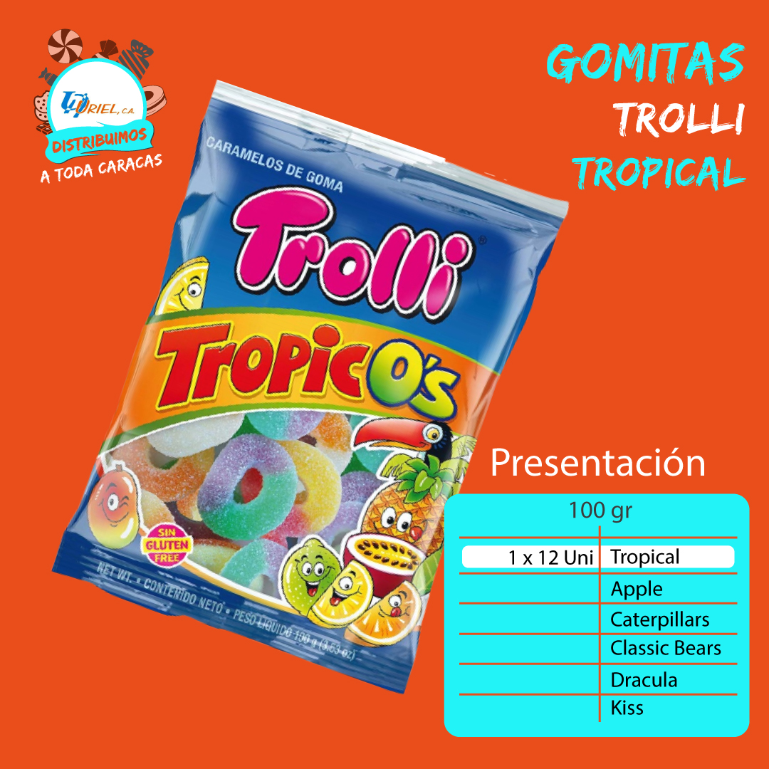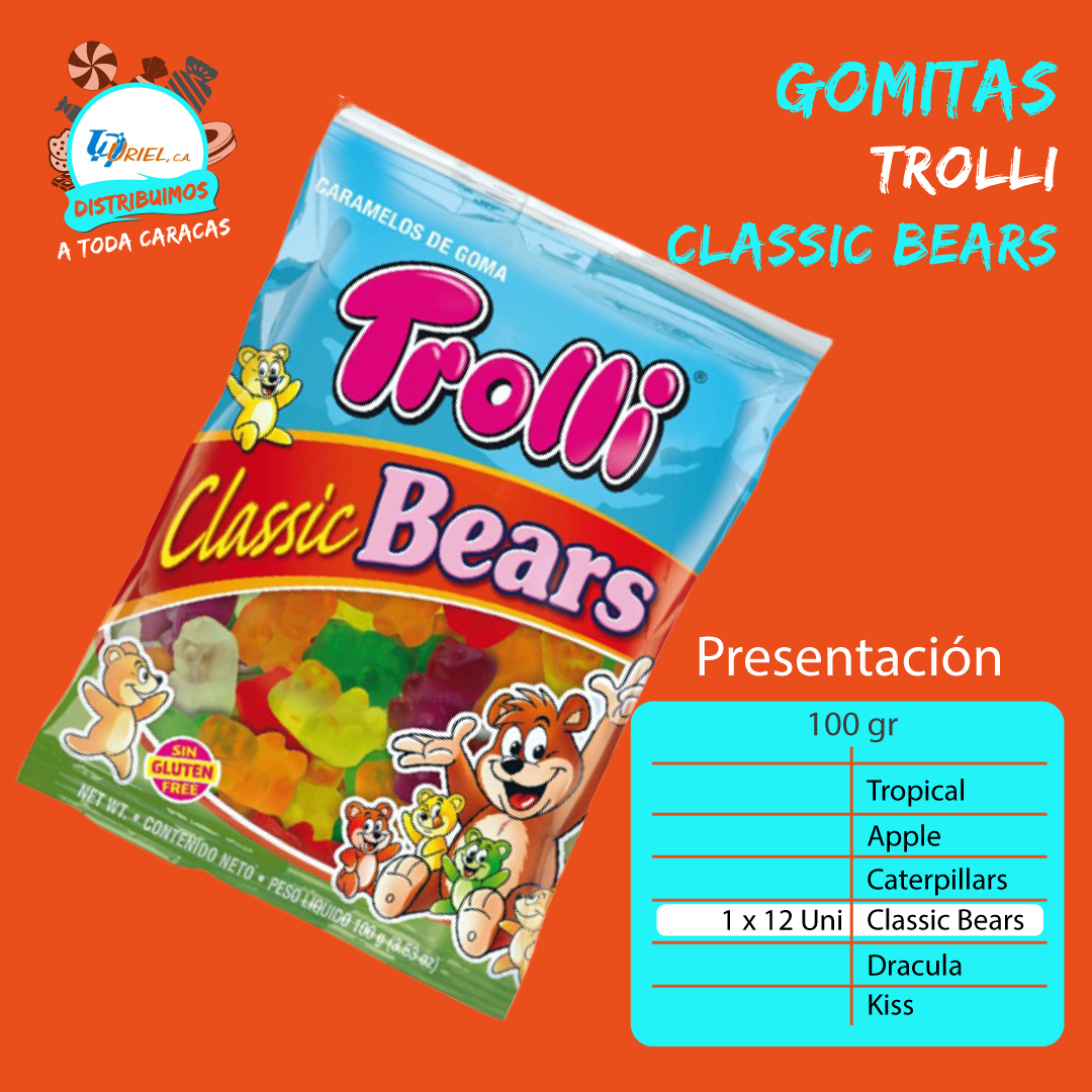 Gomitas Trolli 100 gr., 12 unidades, Tropical, Apple, Caterpillars, Classic Bears, Drácula y Kiss.